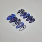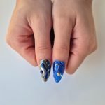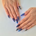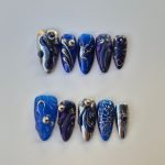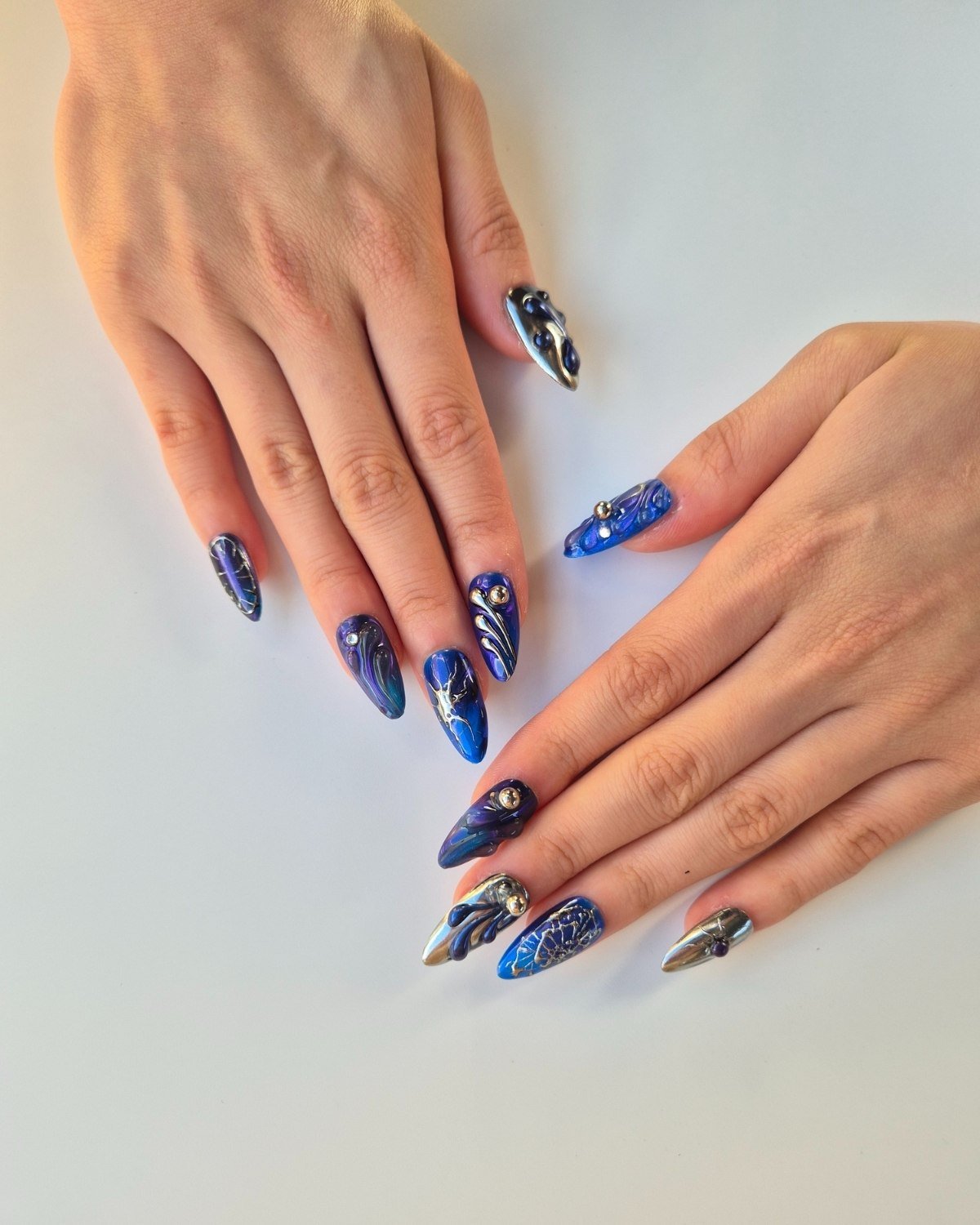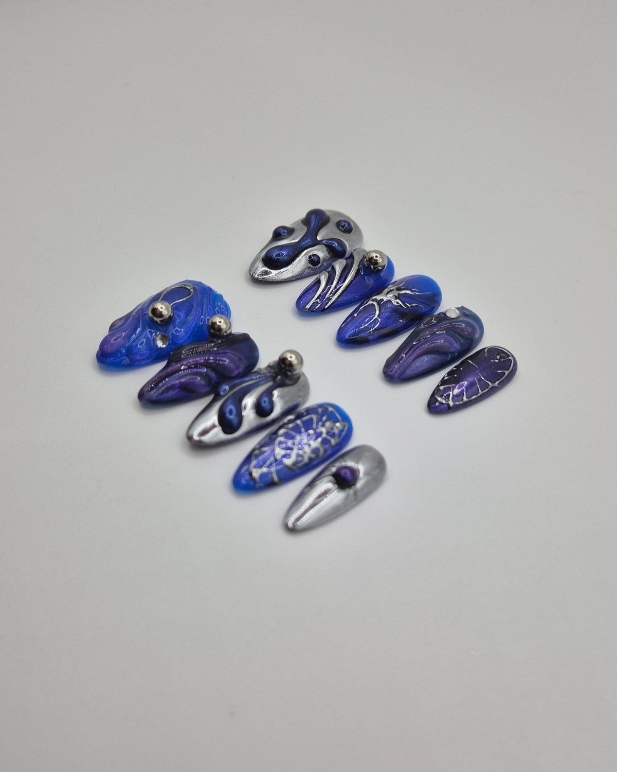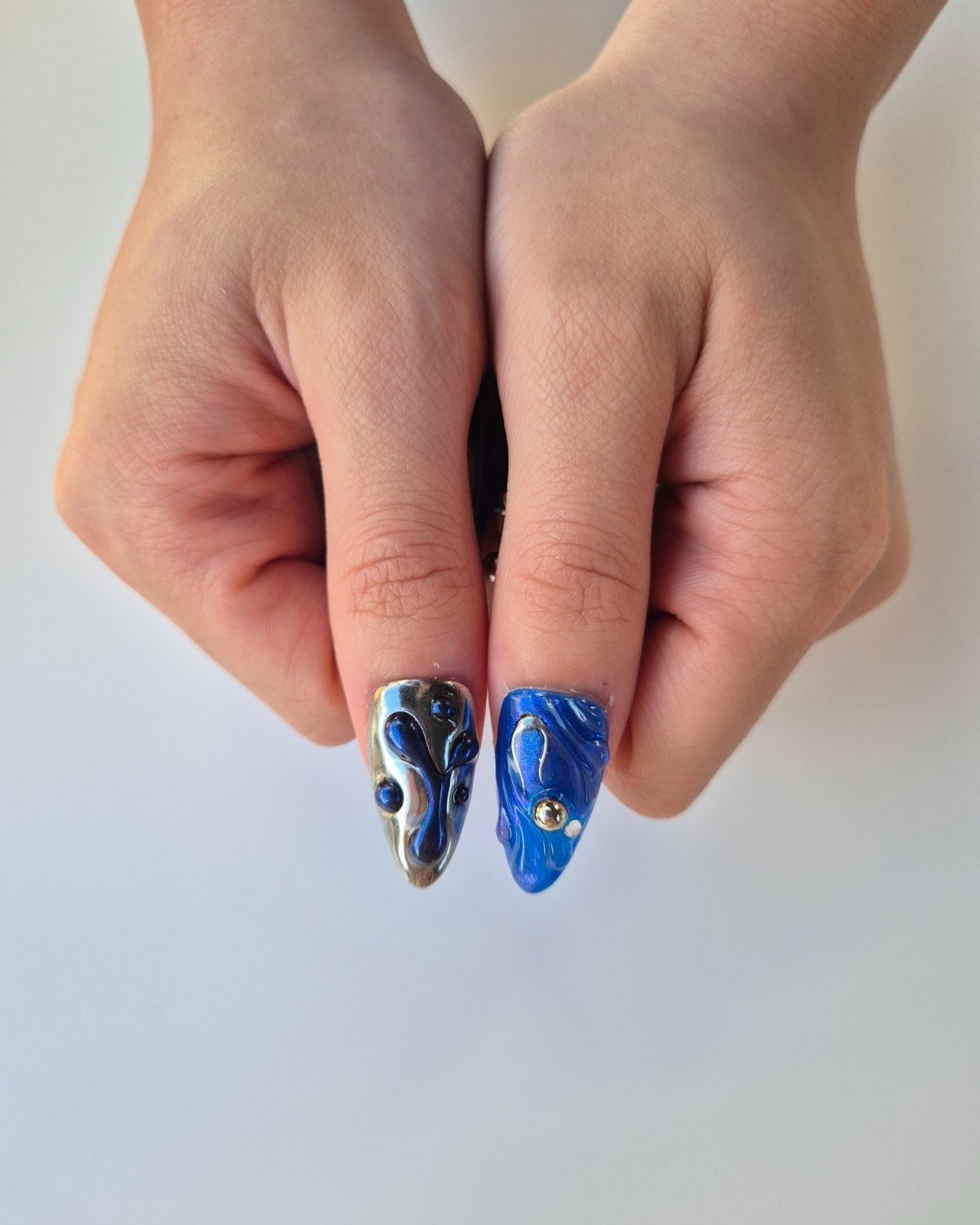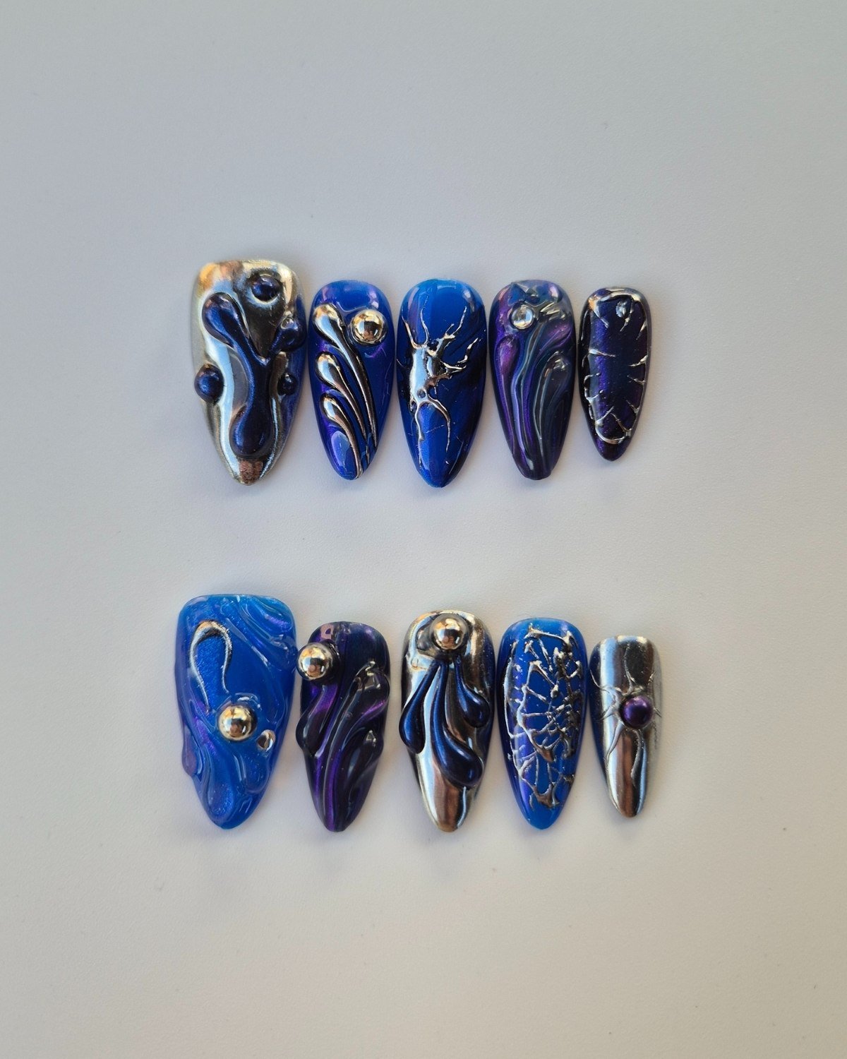 A striking mix of cobalt blue and chrome tones layered with three-dimensional texture. Each nail is hand-crafted with fluid contours and metallic detailing, accentuated by raised silver spheres that add height and reflective depth. The result is a bold, futuristic design.