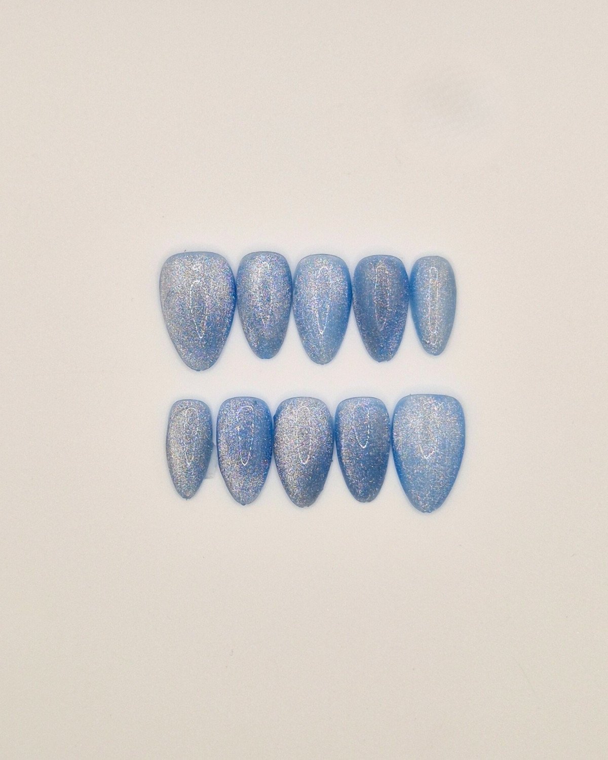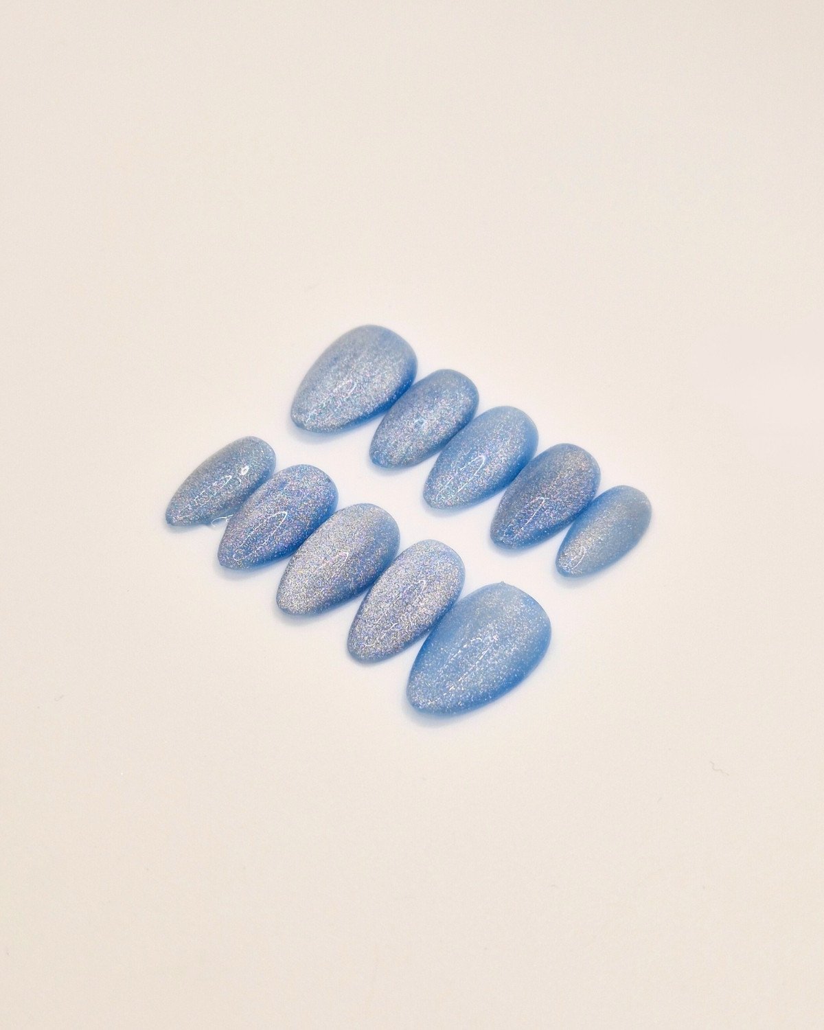 Cool blue tones with fine silver glitter create a sleek, dimensional finish that catches light with subtle movement.