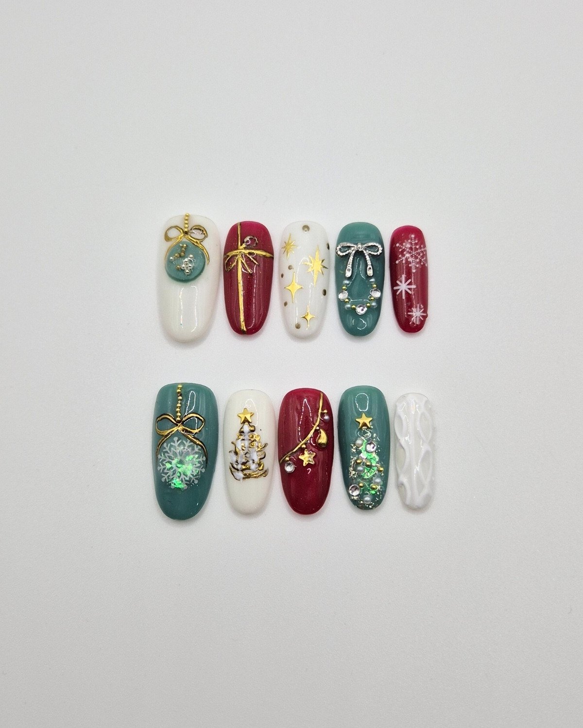 A classic green, red and white Christmas design with hand-painted baubles and a textured festive finish.
