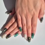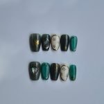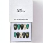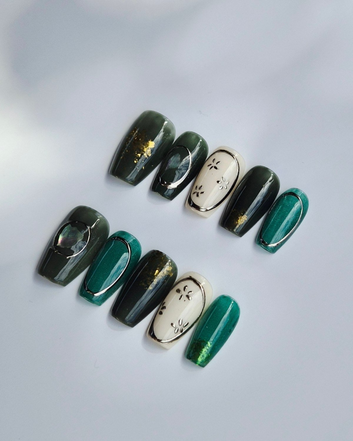Rich emerald and ivory tones edged with fine metallic detail create a look of quiet opulence. Each nail is hand-painted for a polished, timeless finish.