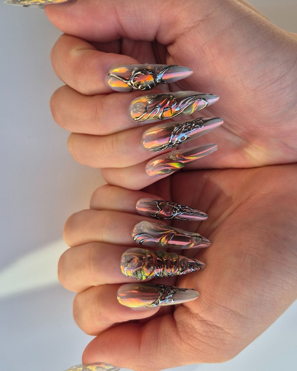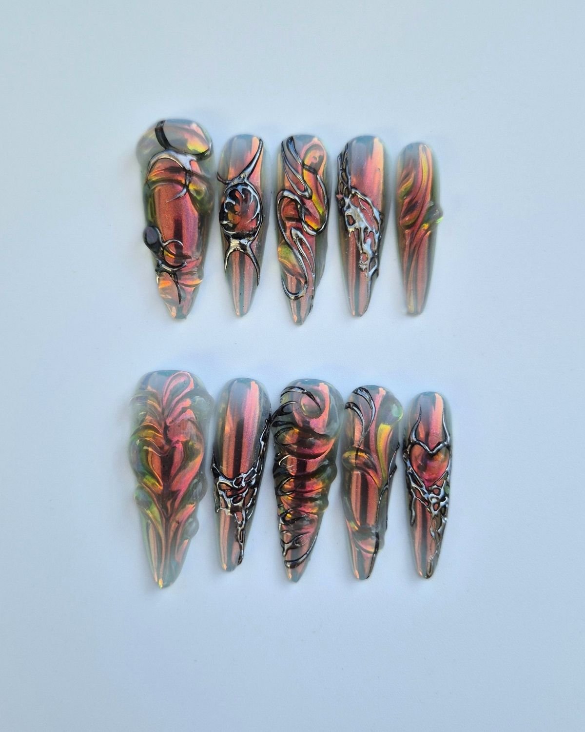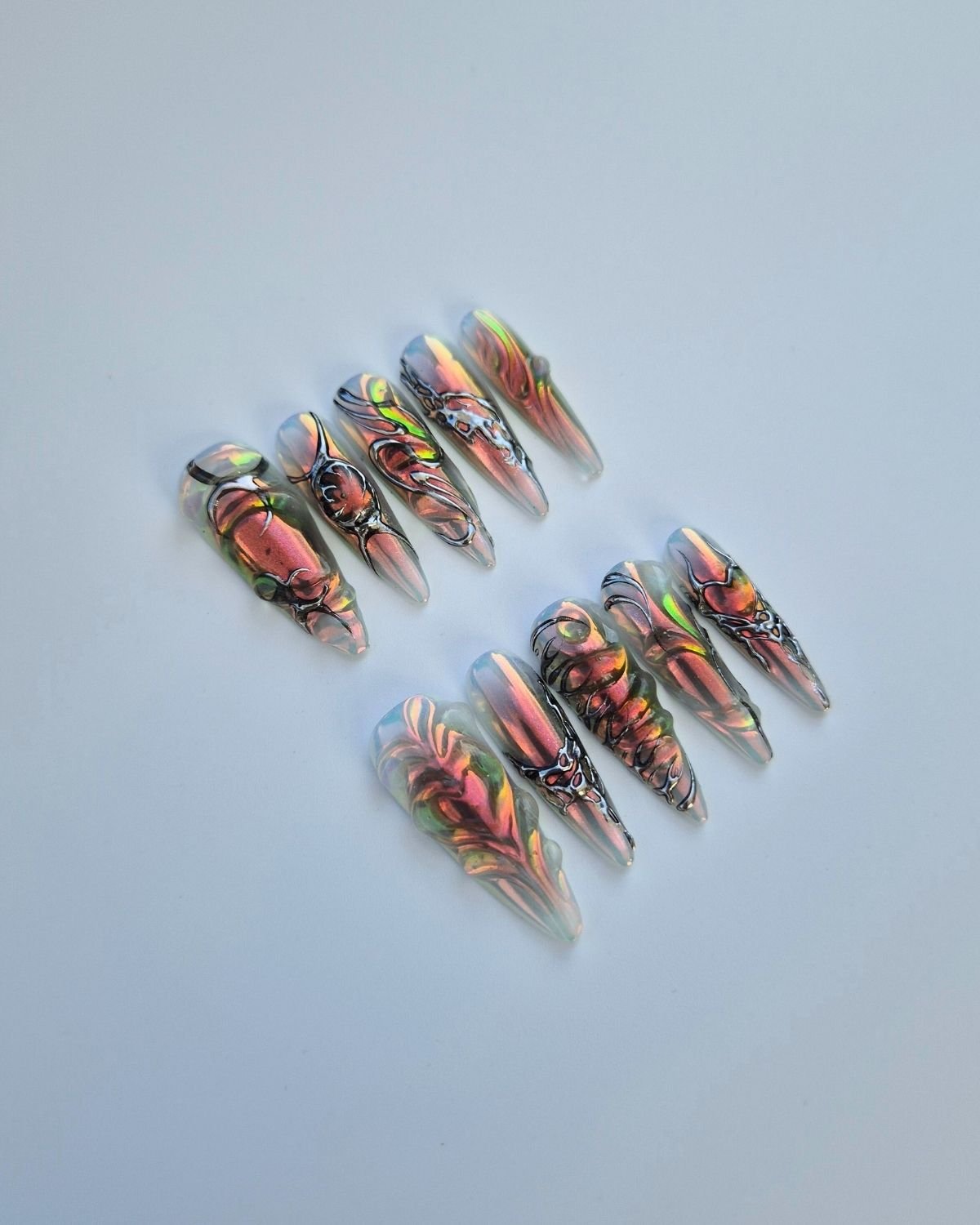Red, copper, and green iridescence layered with sculpted 3D texture. The fluid, reflective surface catches light from every angle for a bold, dimensional finish.