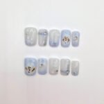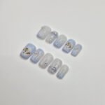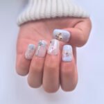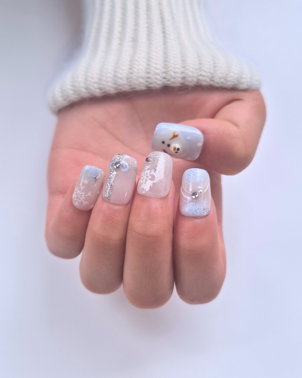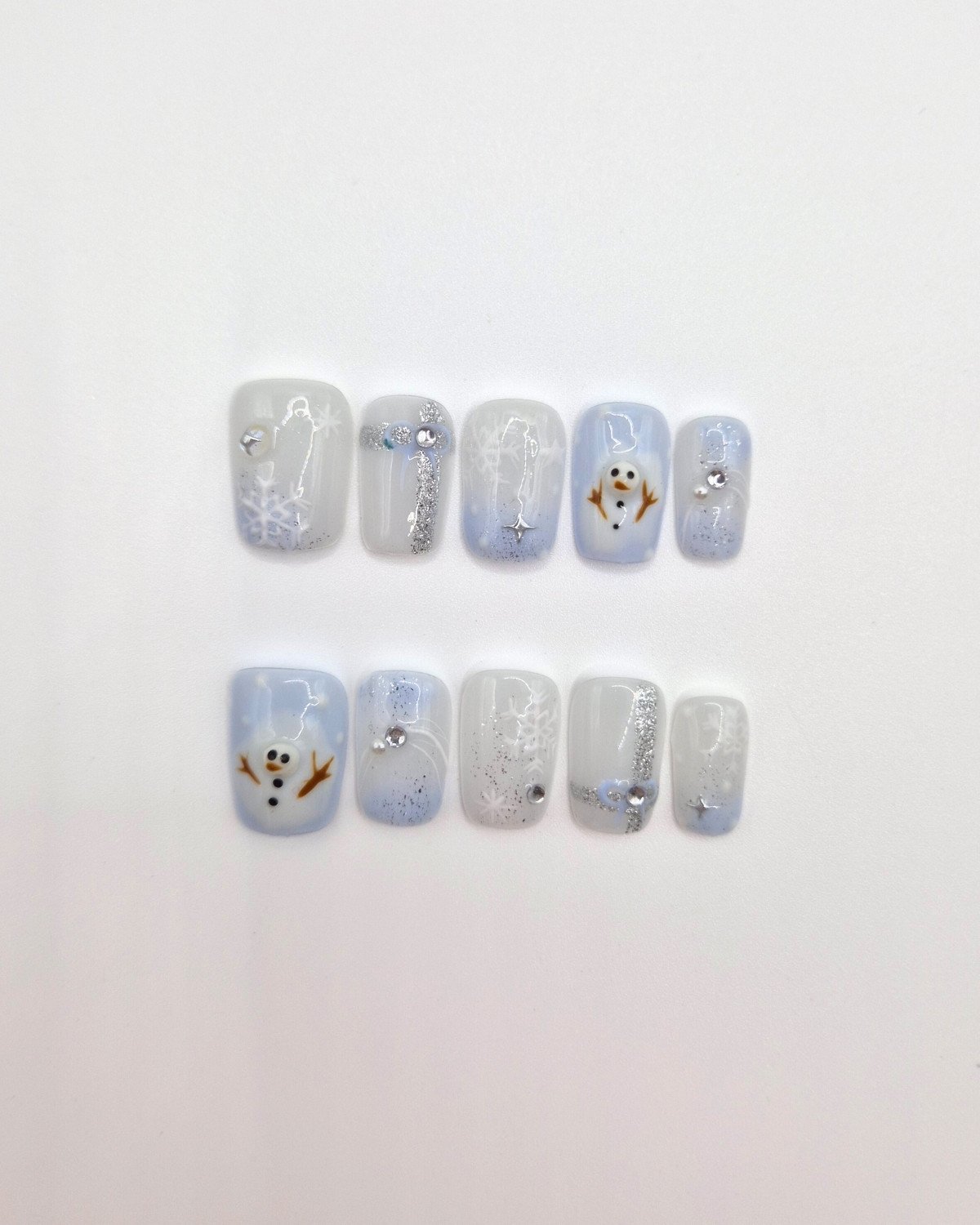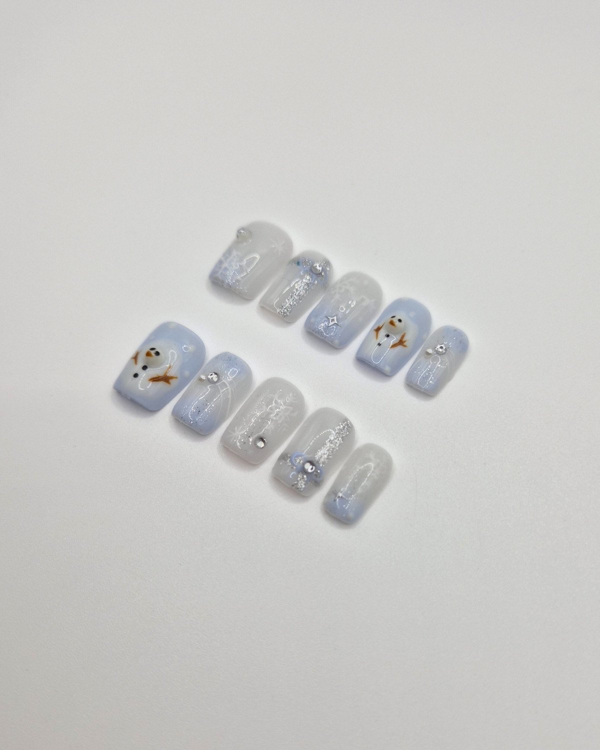 A soft blue and white winter design with hand-painted snowflakes, gentle shimmer and a cute snowman feature nail. Frosty brings a playful look that still feels polished and seasonal.