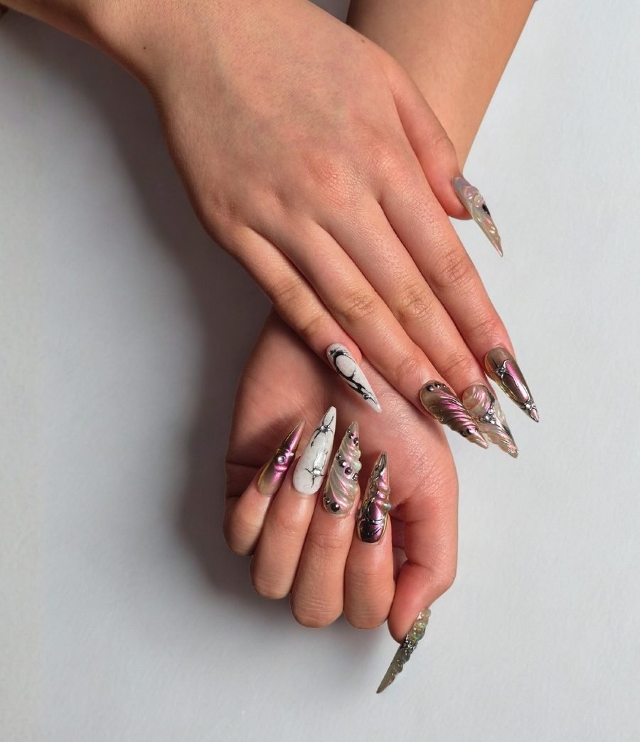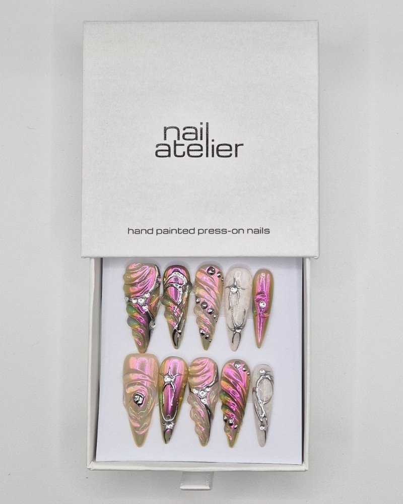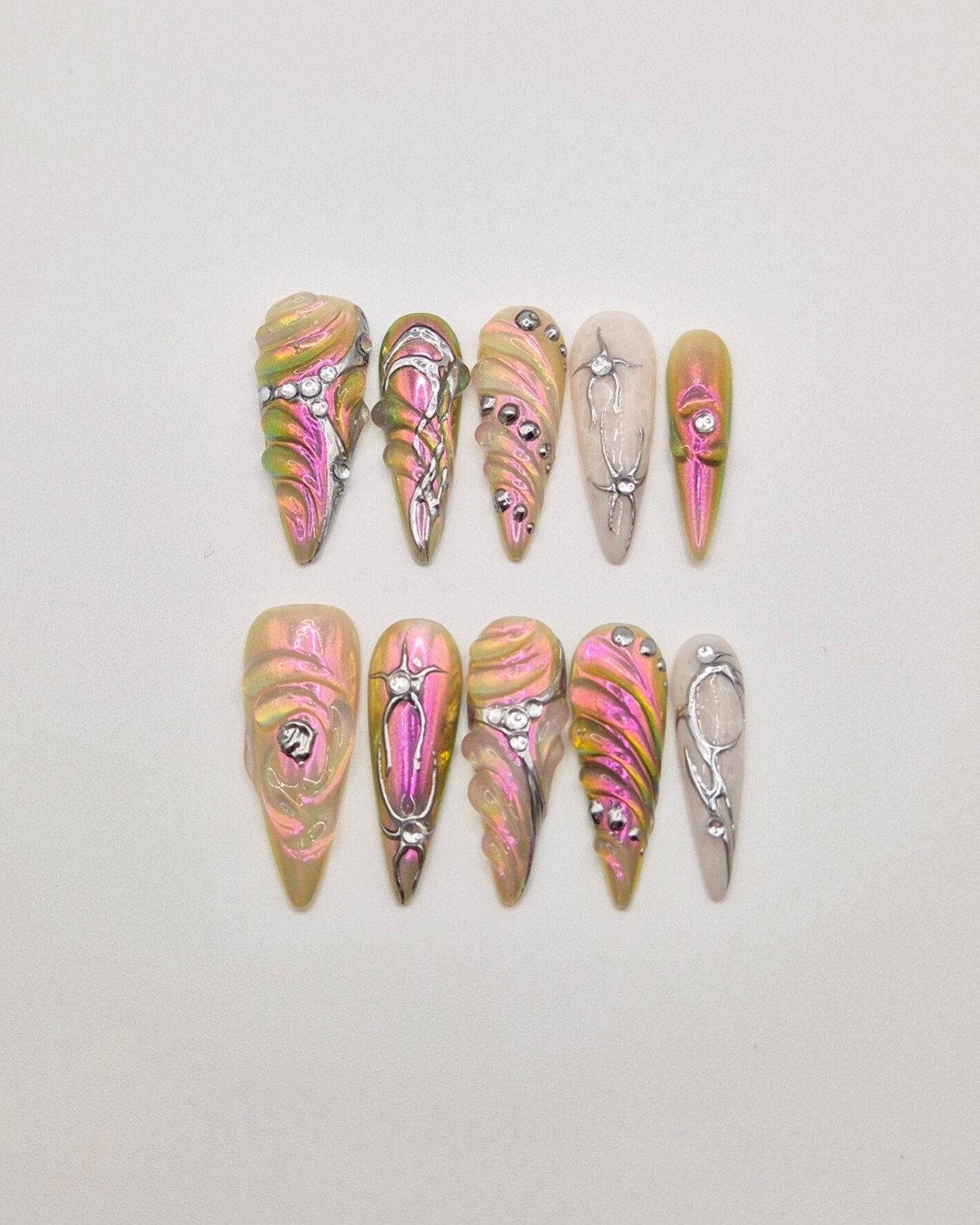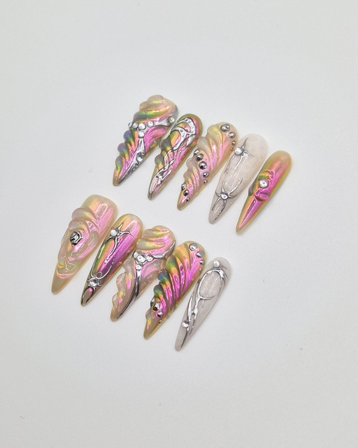 Iridescent fusion of pink, gold, and silver with dimensional chrome depth.