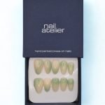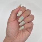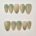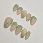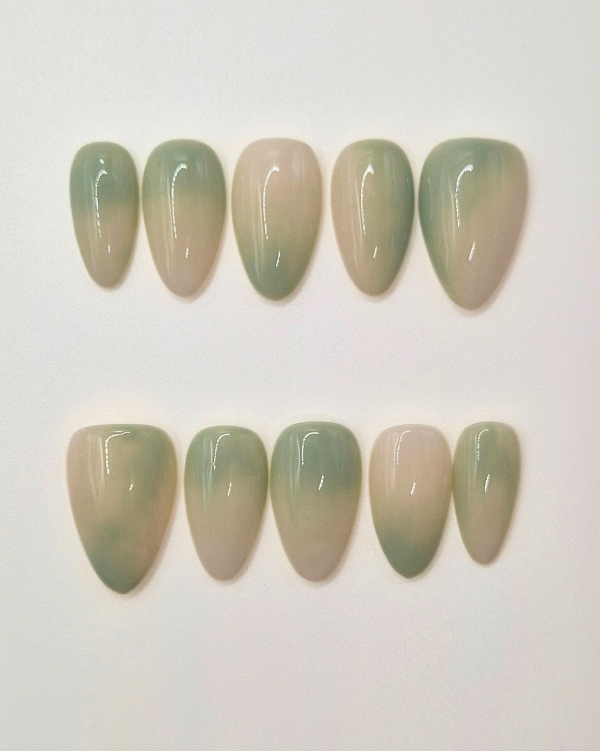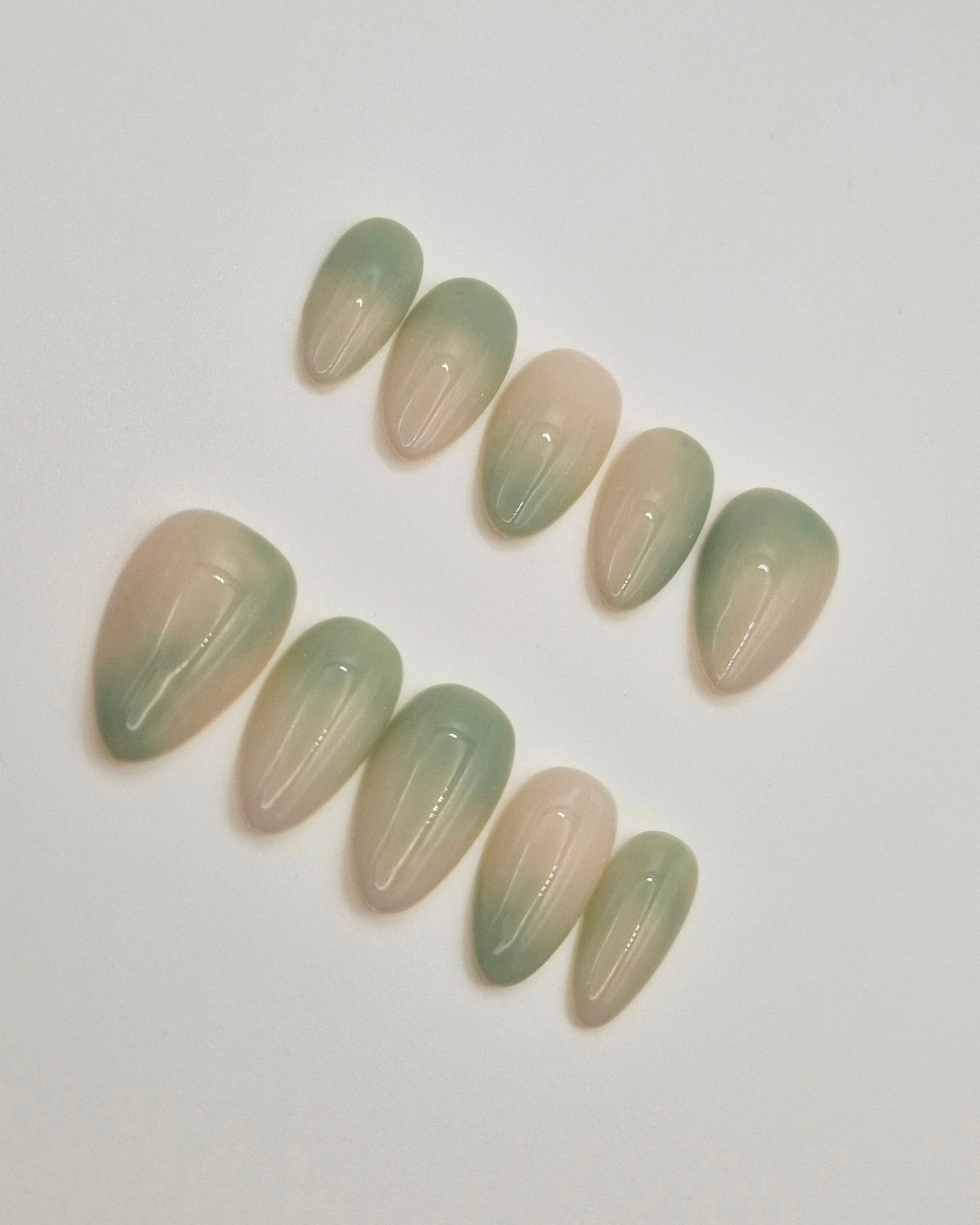 Misty green and ivory tones flow together in a soft gradient. Each nail is hand painted with a glazed texture that feels clean and polished.