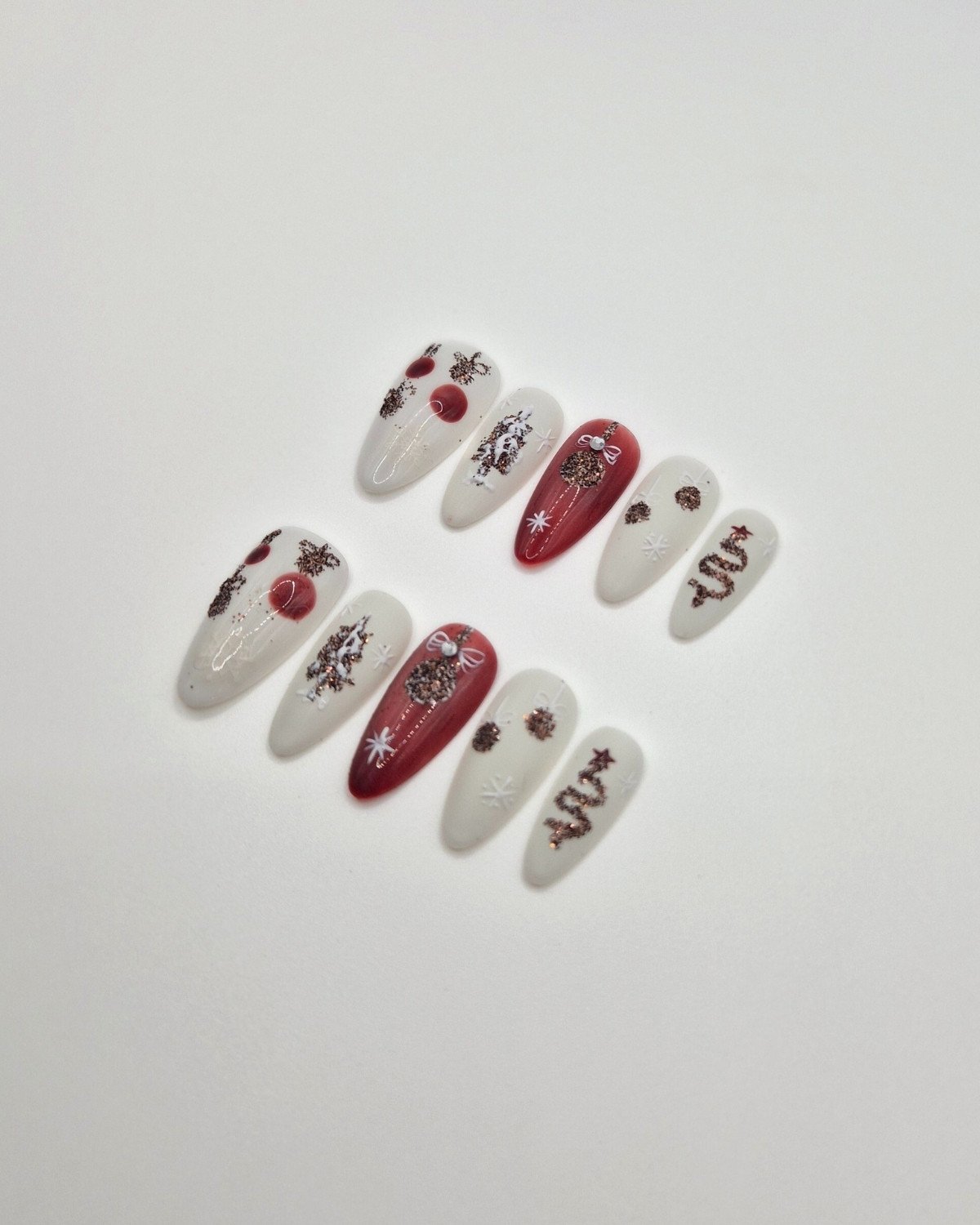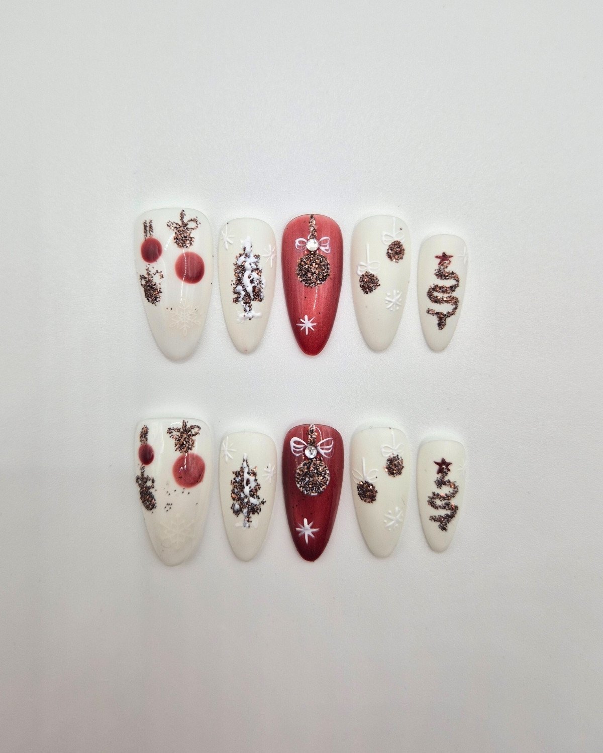 A white and red Christmas design with bauble, tree and snowflake accents.
