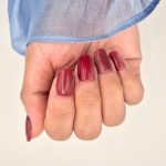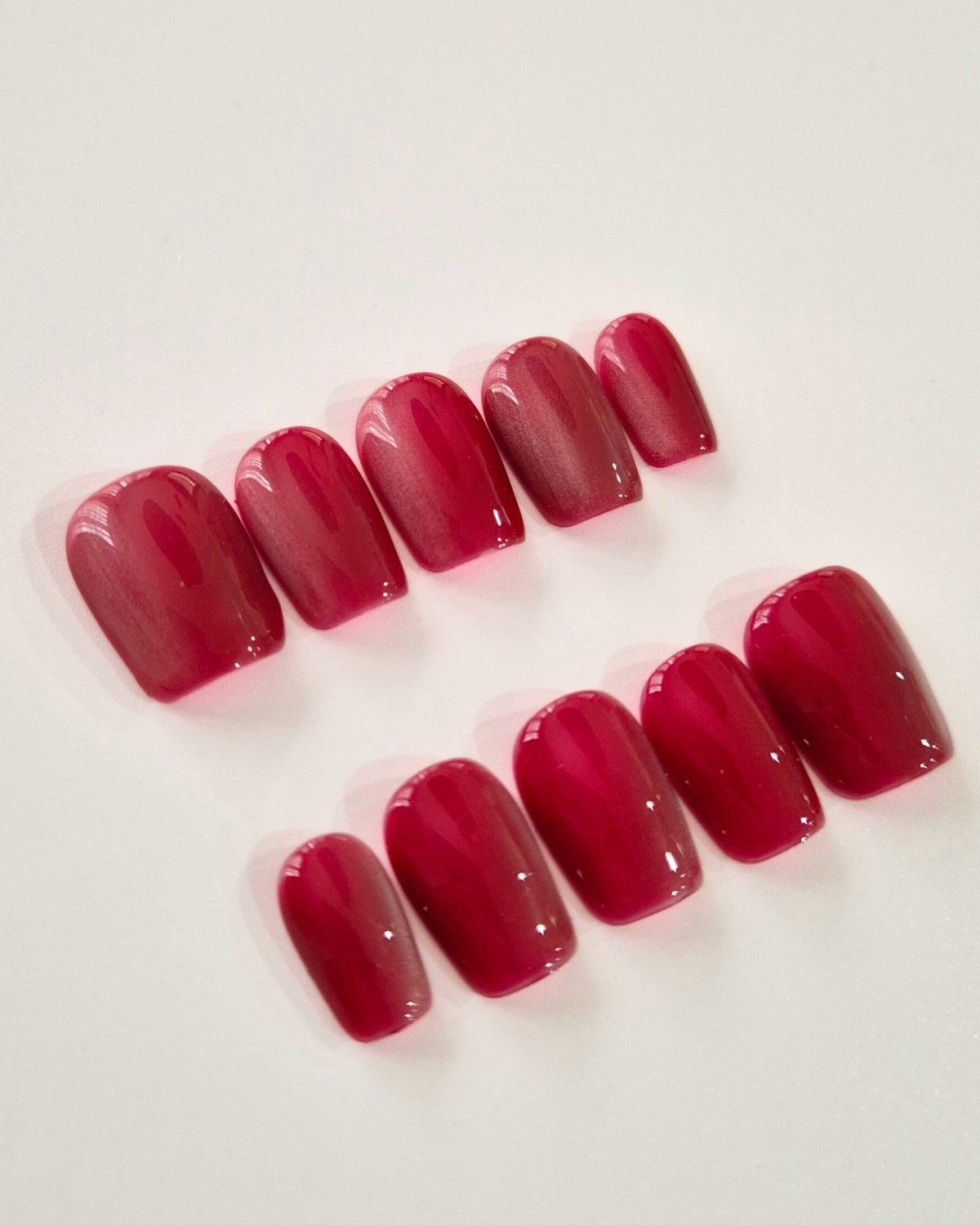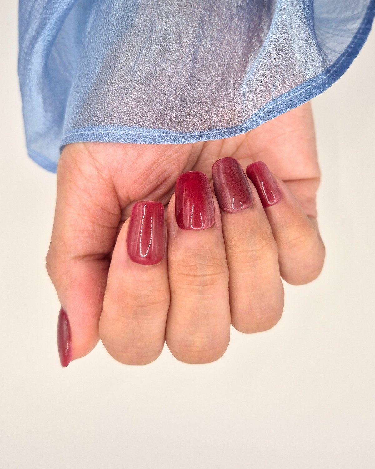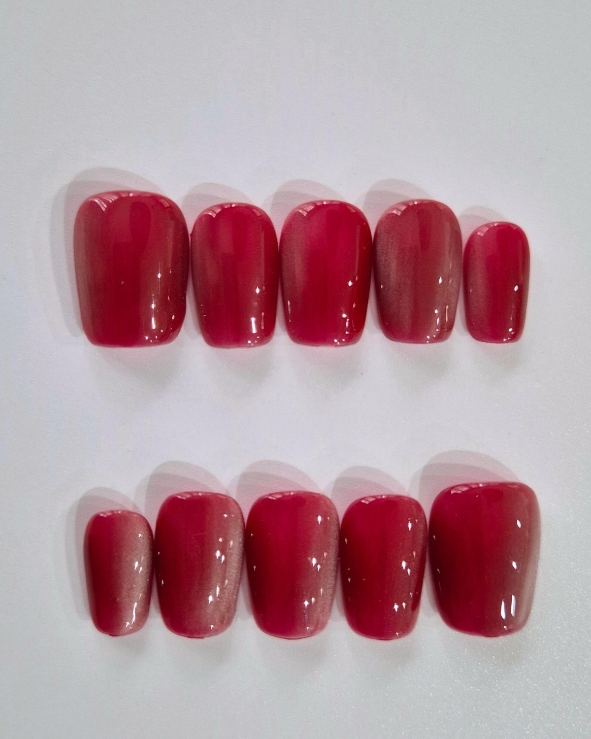 A cool-toned red with subtle cat-eye reflection. Polished, balanced, and timelessly chic.