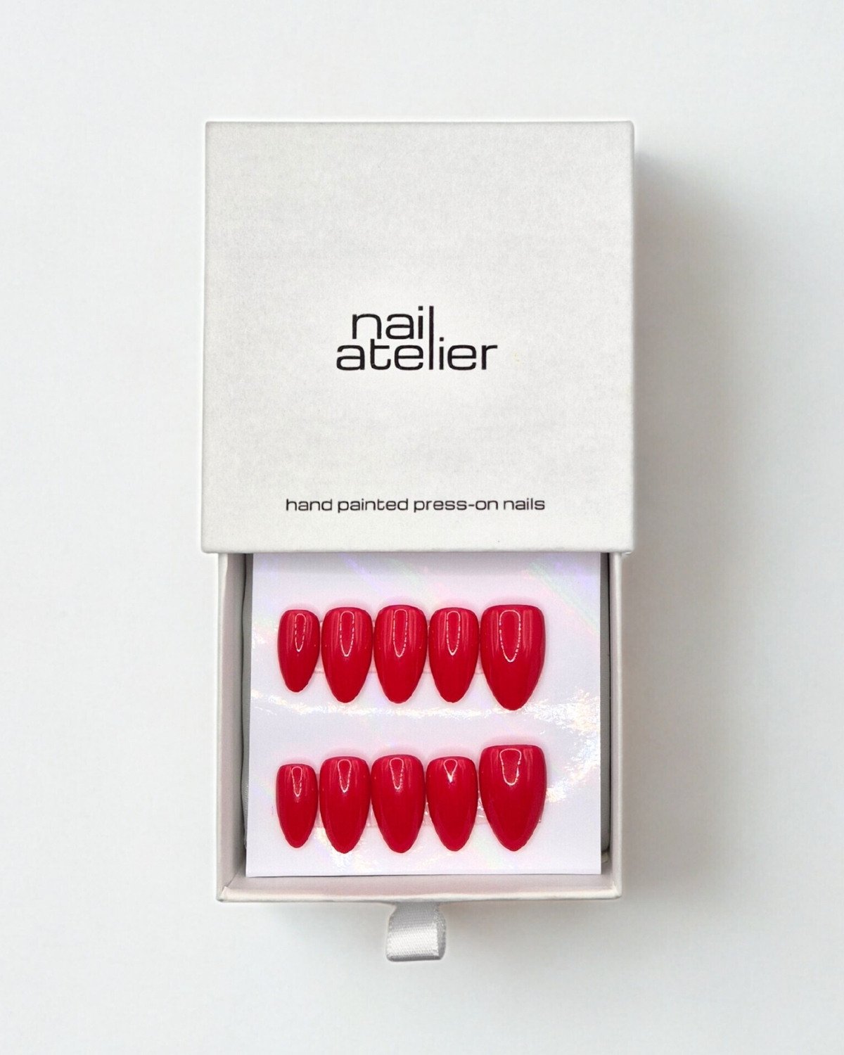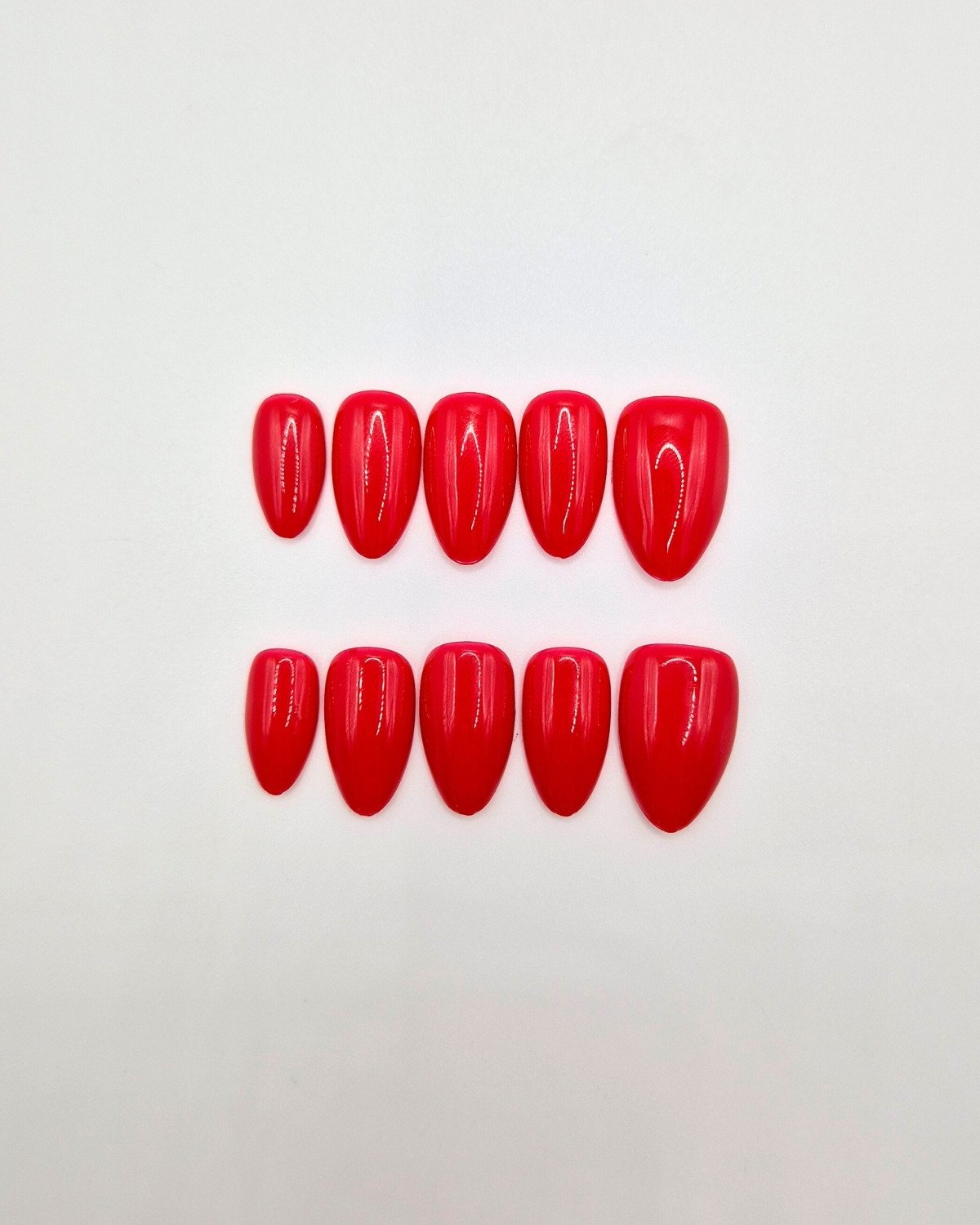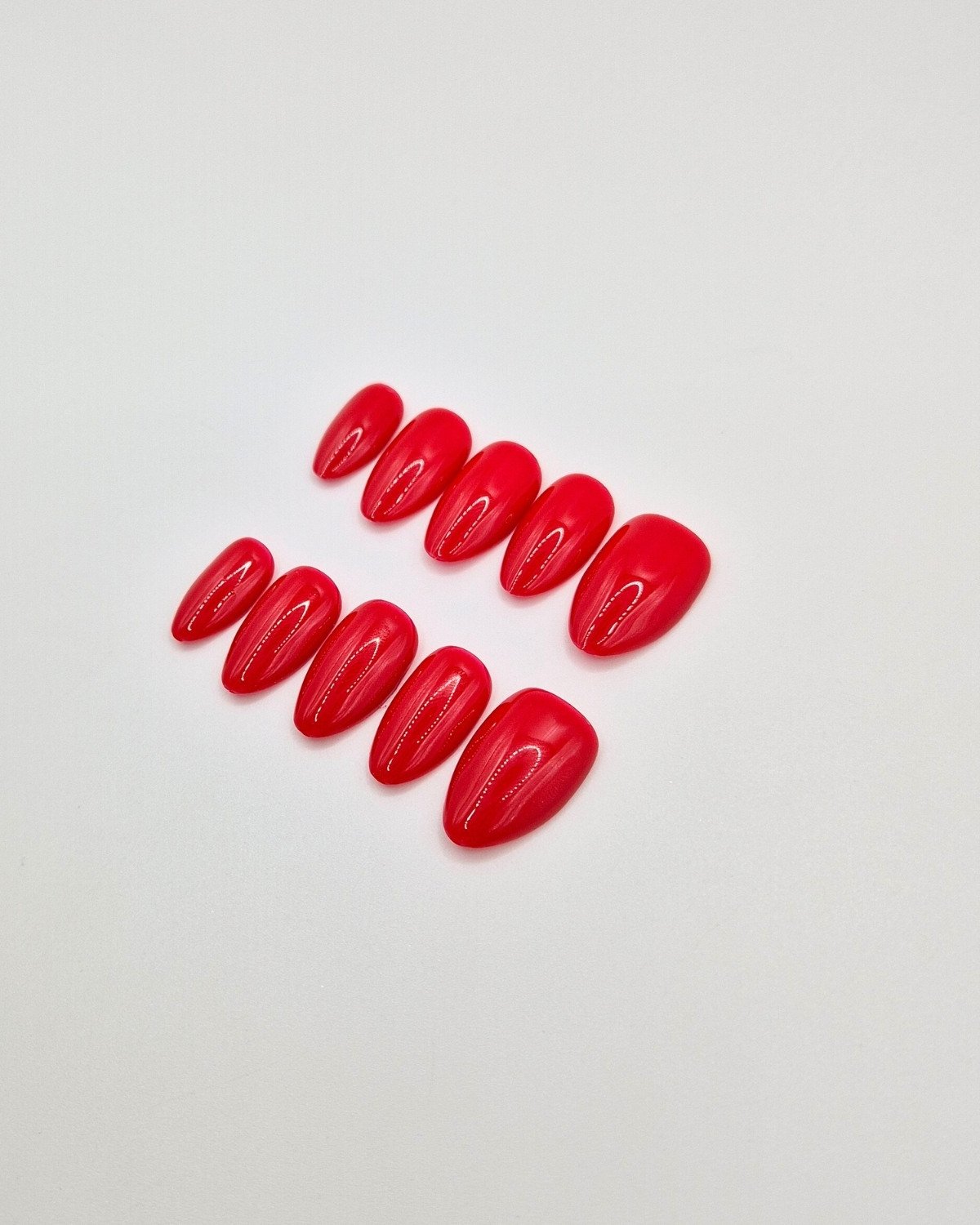 A rich, glossy classic red with a smooth finish. Each nail is hand-painted for even colour and high-shine impact, creating a polished look that feels bold, refined, and instantly elevated.