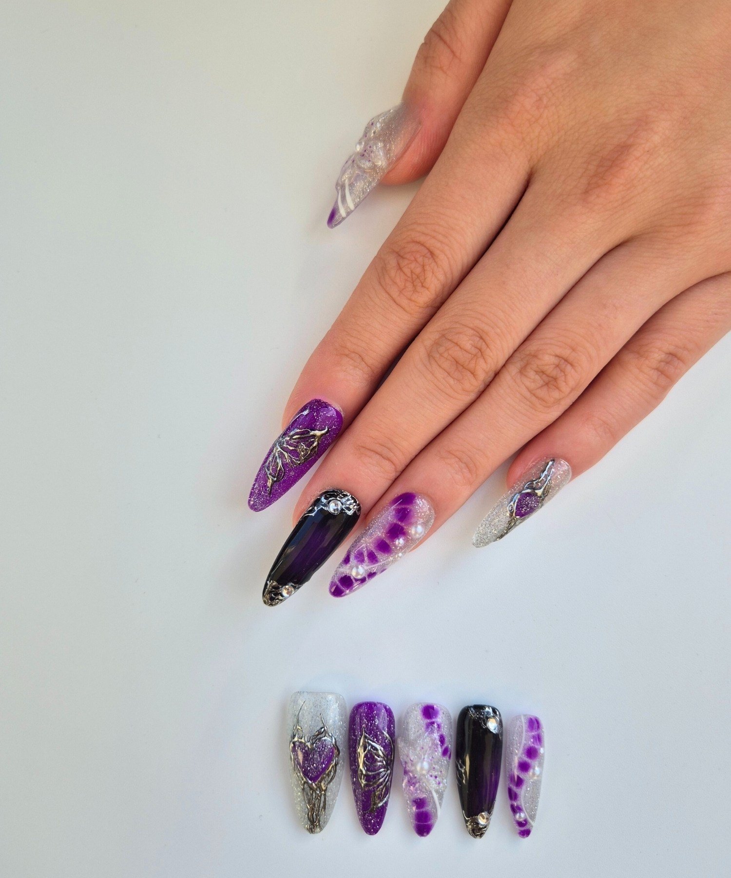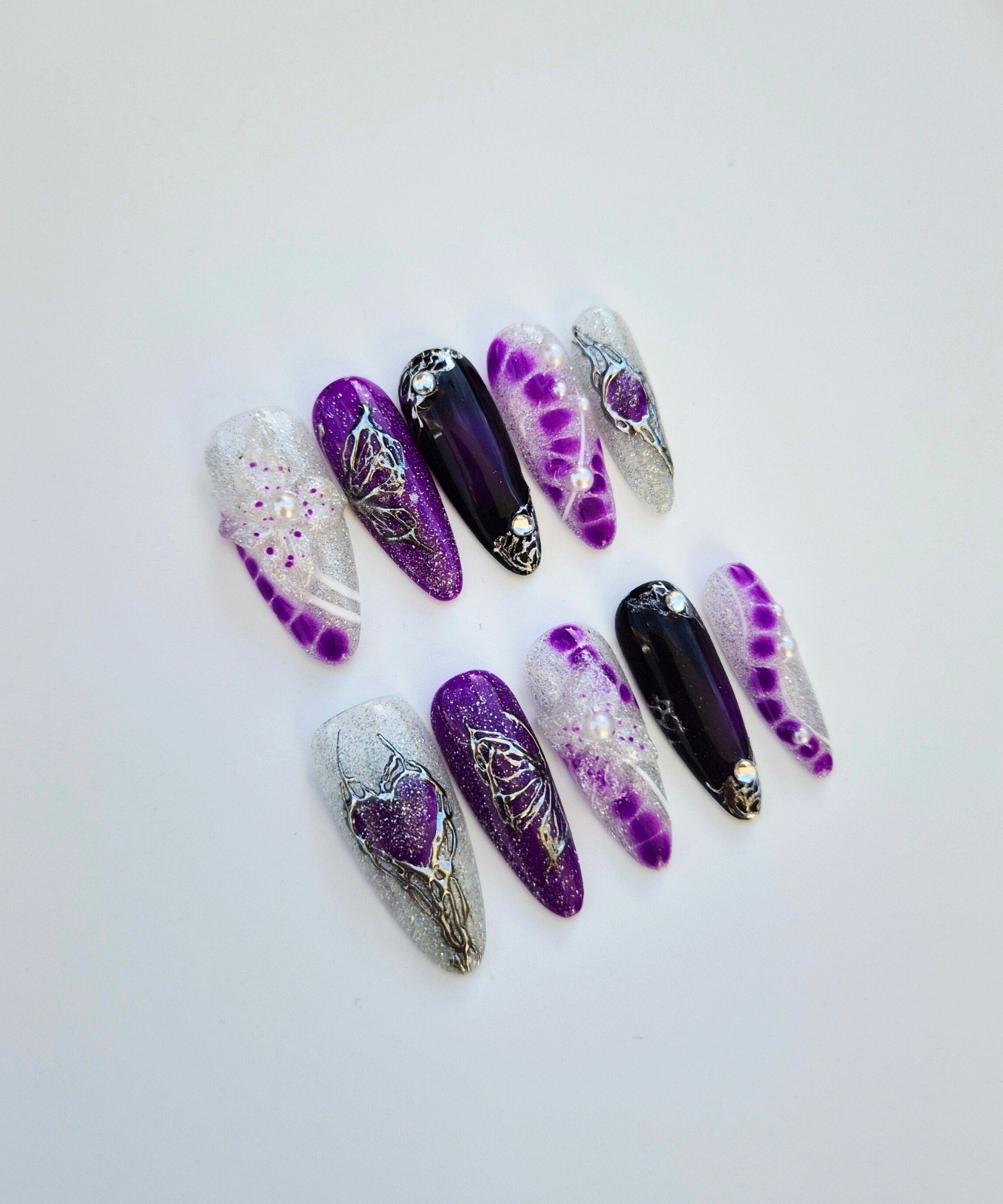 A sculpted blend of soft florals and subtle edge. Hand moulded flower accents pair with metallic butterfly detailing and serpentine pattern work, finished with a veil of glitter for dimensional shimmer.