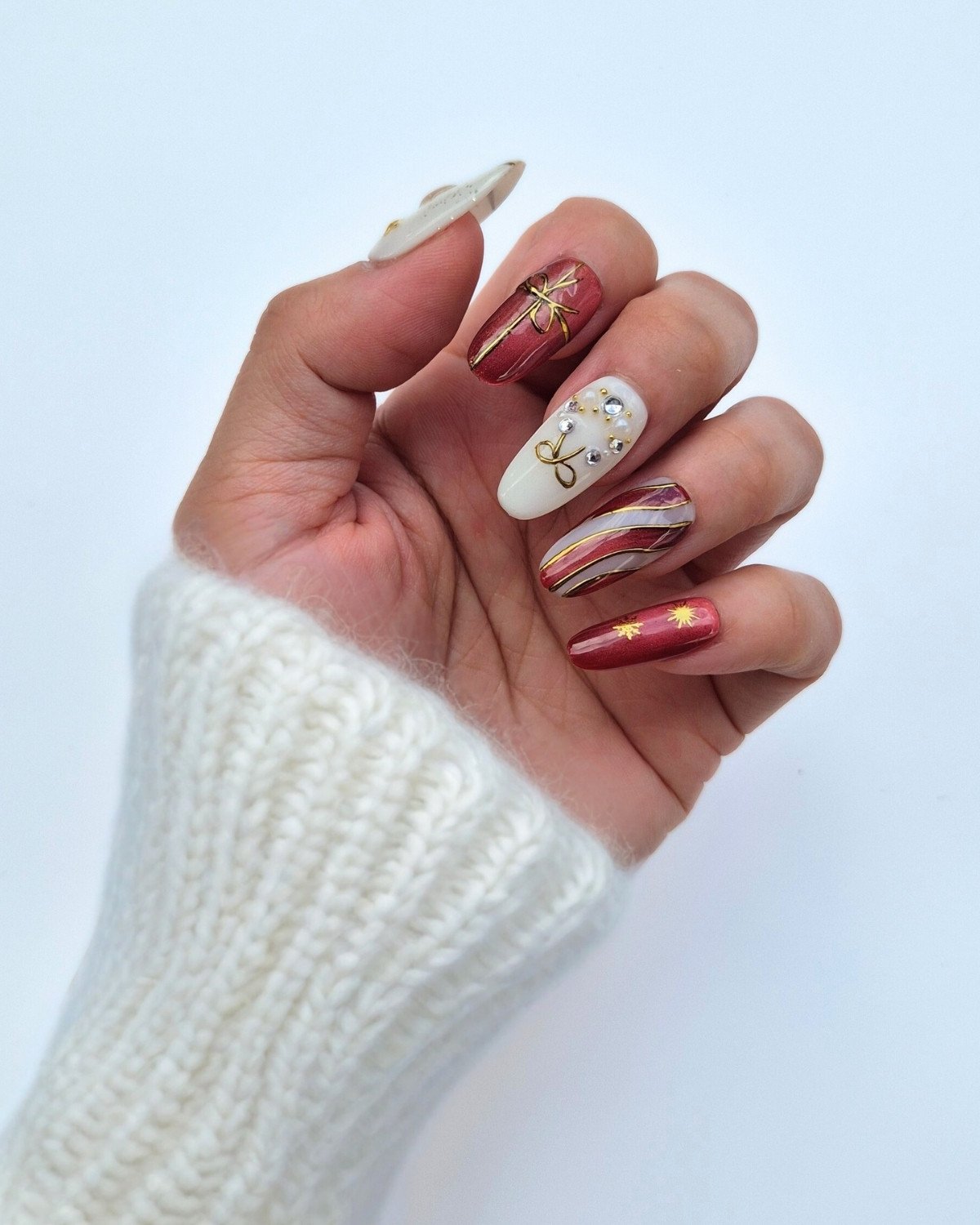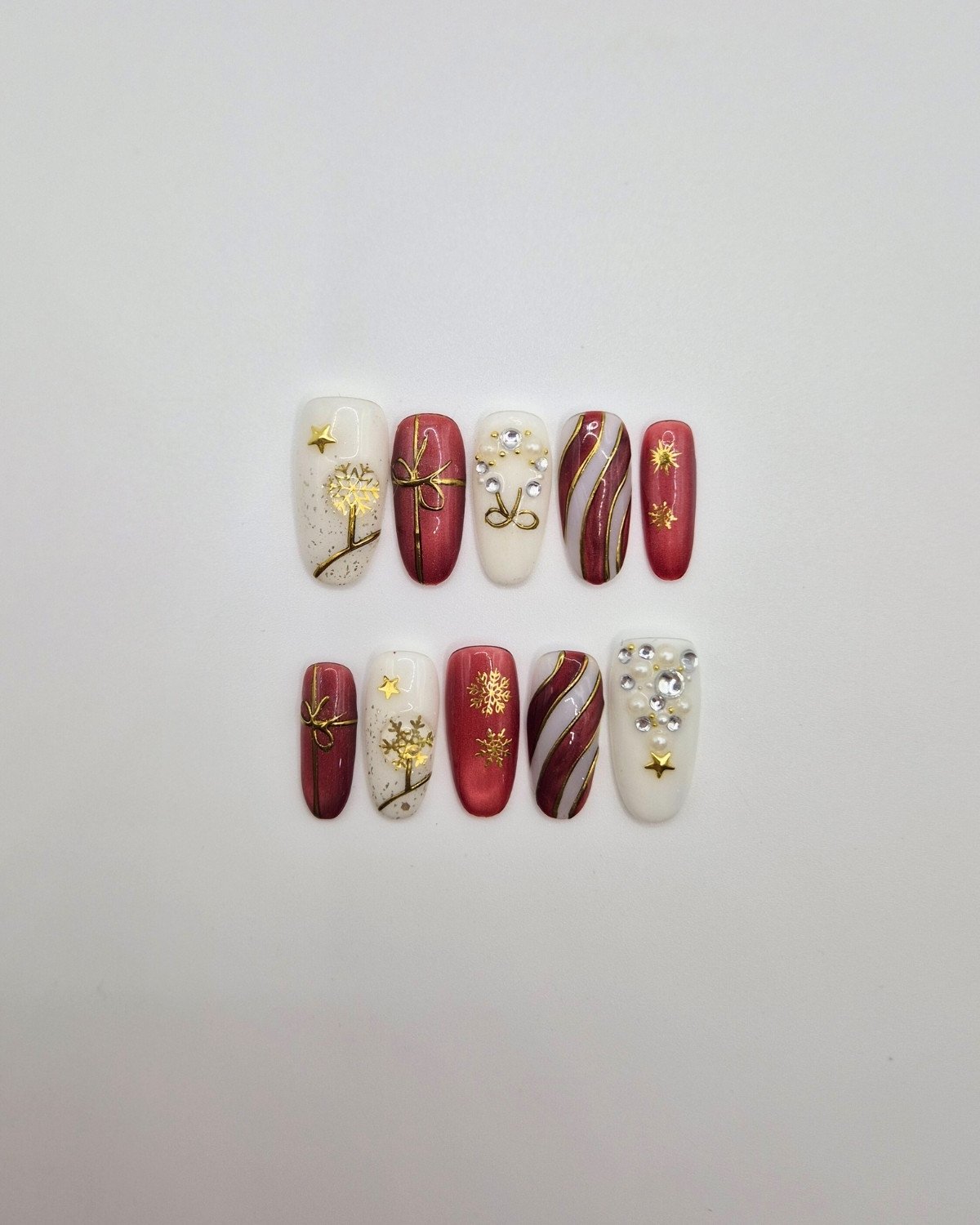 A classic red and gold design with ribbon accents, snowflakes and gold tree details. The raised gel accents add a touch of depth and texture.
